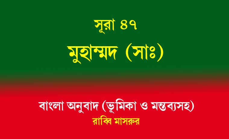 উত্তর: সূরা ৪৭ মুহাম্মদ (সাঃ) হল মদীনায় অবতীর্ণ পবিত্র কুরআনের সূরা, যা আল্লাহর প্রতি ঈমান, নবী মুহাম্মদ (সাঃ)-এর অনুসরণ, ইসলামের পথে সংগ্রাম এবং মুমিনদের চূড়ান্ত বিজয়ের উপর জোর দেয়।